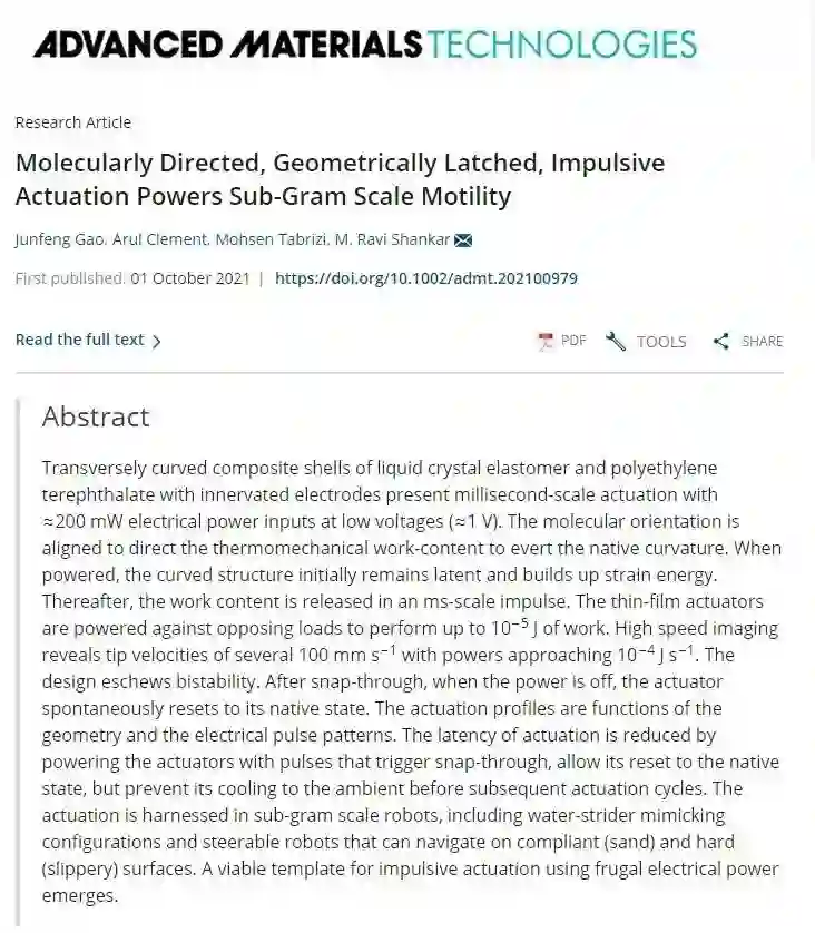 这项研究发表在AdvancedMaterials Technologies杂志上,题目为“Molecularly Directed, Geometrically Latched, Impulsive ActuationPowers Sub-Gram Scale Motility”,由 Junfeng Gao、Arul Clement、Mohsen Tabrizi 和 M. Ravi Shankar 合著。