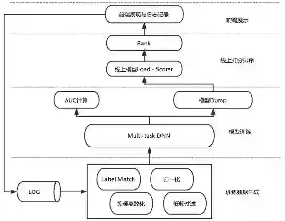如上图所示,模型排序流程包括日志收集、训练数据生成、模型训练和线上打分等阶段。当推荐系统对浏览推荐场景的用户进行推荐时,会记录当时的商品特征、用户状态与上下文信息,并收集本次推荐的用户行为反馈。在经过标签匹配和特征处理流程后生成最终的训练数据。我们在离线运用PS-Lite框架对Multi-task DNN模型进行分布式训练,通过离线评测指标选出效果较好的模型并加载到线上,用于线上排序服务。