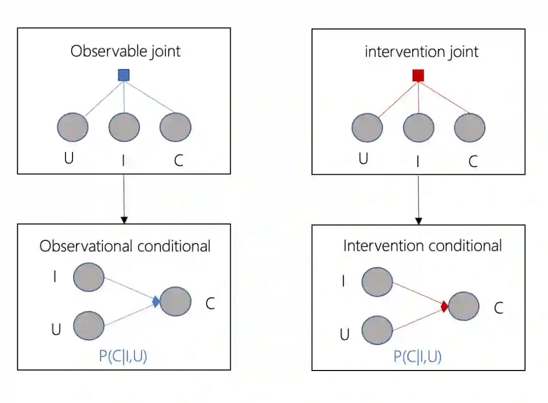 1.在短视频推荐系统里的典型场景是,给用户U展示短视频I,预估点击事件C发生的概率,它们三者构成了observable joint,推荐系统不断收集用户反馈,在观测到的数据上学习深度学习模型的参数。