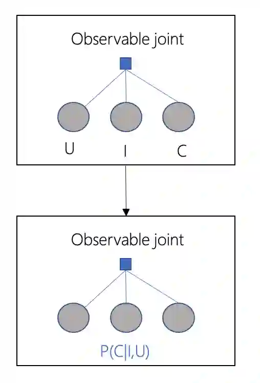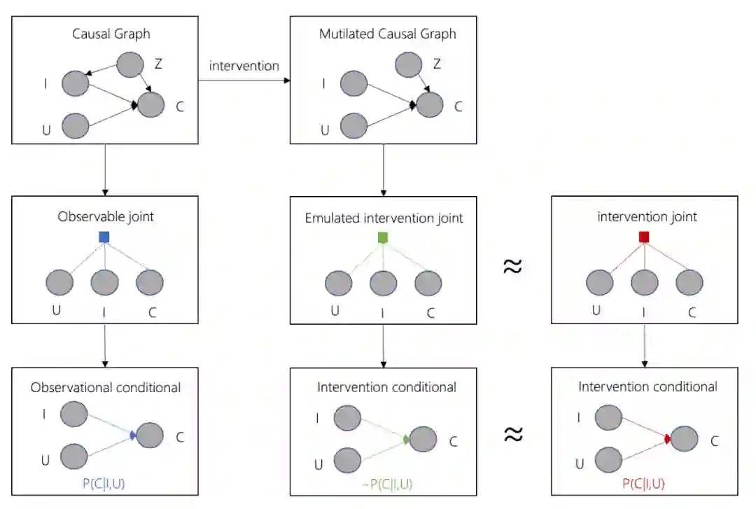同理,如果我们能够根据干扰后的联合概率分布(intervention joint)获得观测数据,我们也能用监督学习的方式求解,但是实际上,我们并没有这样的数据,那么,基于人工经验,创造表示变量之间因果关系的causal graph,如果因果图比较正确,通过主动干预,我们能获得与intervention joint近似的联合概率分布(emulated intervention joint),从而得到的近似计算结果