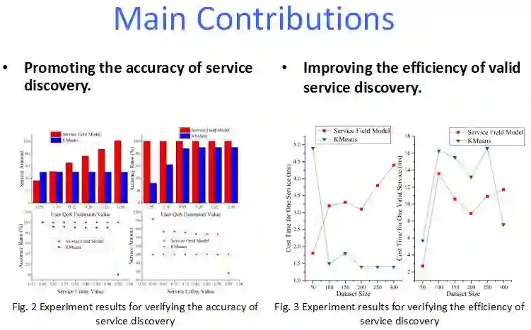 本文的贡献有三个方面。首先,本文使用服务能级的抽象来表示服务的状态,以及提出了服务跃迁机制研究云服务在不同能级下的变化和重新划分。其次,本文提出了一个用户可接受服务域的概念用来描述满足用户请求的服务,以及相应的服务发现方法,这样就可以显著减少服务的搜索范围并且提高服务发现的速度和准确度。第三,本文设计了一系列算法来实现场模型的生成、用户可接受服务域的生成、服务跃迁机制和面向用户的服务发现。本文使用QWS数据集进行了大量实验,以验证和评估本文提出的模型和算法。实验结果表明,本文提出的场模型能够很好地支持多云环境下服务的动态和可演化特性的表征,并且本文提出的算法可以提高服务发现的准确性和效率。