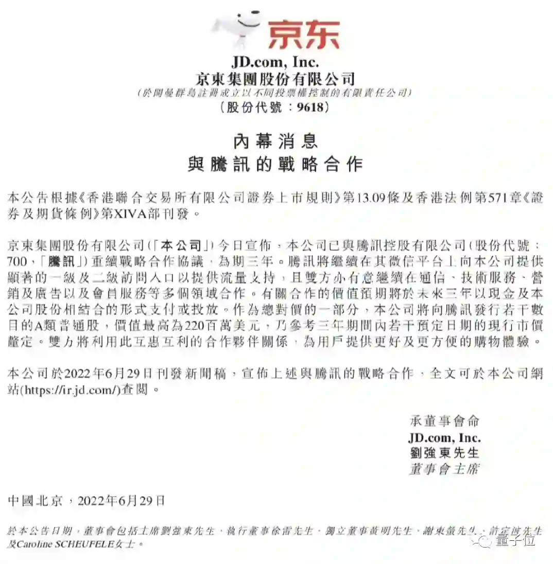 昨日晚间,京东在港交所发布公告称,已与腾讯控股重续战略合作协议,为期三年。
