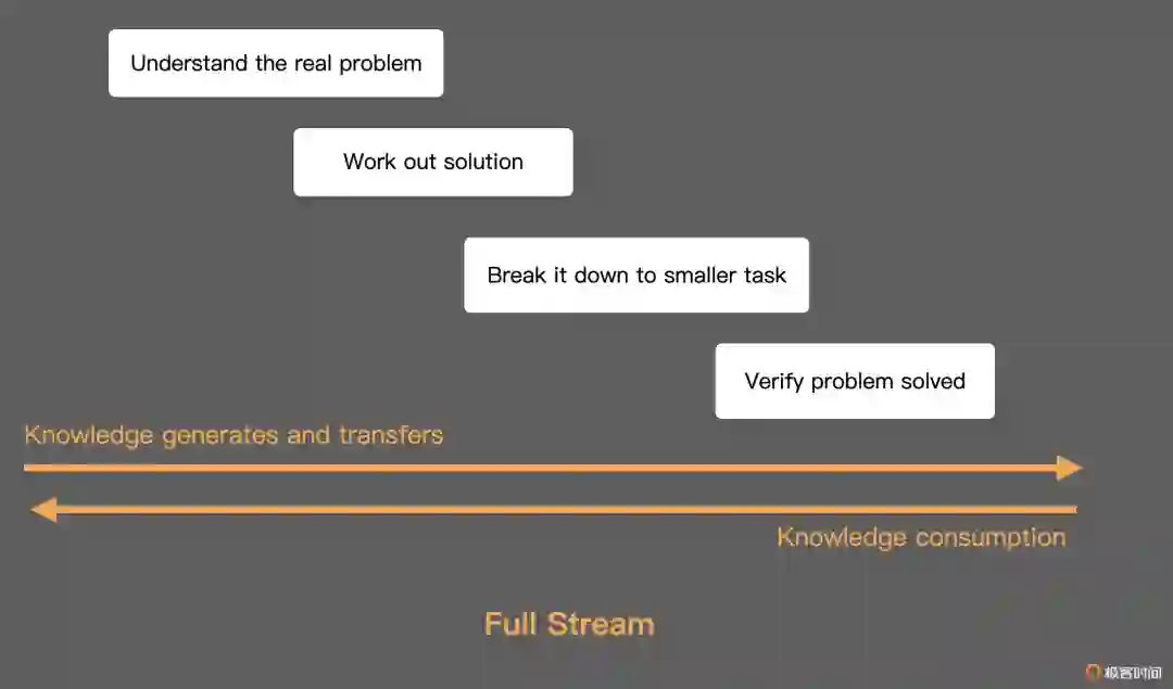 这个时候我们可以把软件开发过程看成一个围绕着知识的 Stream,也就是一个知识传递和消费的流。那么我们可以得出这样一个结论:如果沿着流的方向去共享更多的知识,就会产生更多的协同效应。