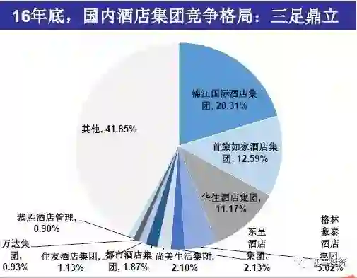 酒店品牌千千万,然而经过了近几年的收并购,三大酒店集团锦江、首旅如家和华住2016年底合计市场份额CR3=44%(以连锁酒店房间数计算),若加上最新美股上市的格林豪泰集团,前四强CR4=49%,寡头地位已经明确。