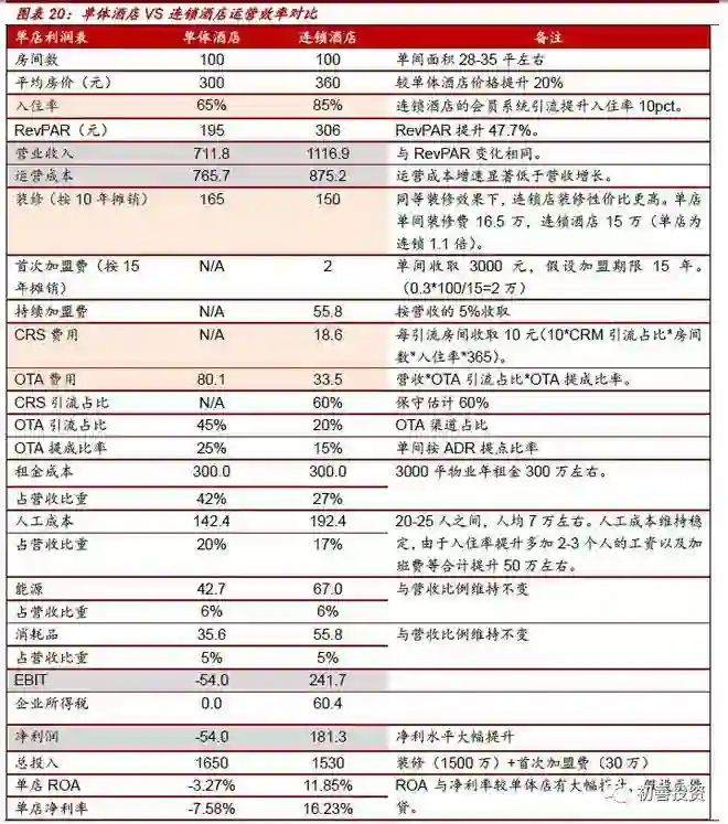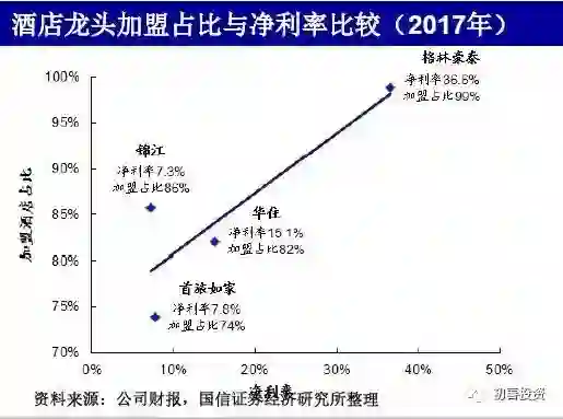 加盟比例越高,净利率越高。某券商测算:加盟收入=首次加盟费用+持续加盟费(加盟店流水的5-9%),加盟毛利率:70-75%,一般仅扣除店长工资,加盟净利率:估算40-50%;直营店盈利能力则方差极大,龙头营业利润率从持平到高峰时期20%-30%。如下图所示,格林豪泰加盟比例最高,净利率更是高达36.6%