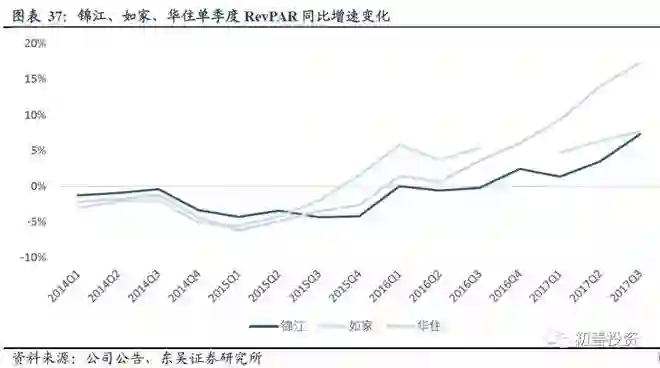 RevPAR是指什么呢?指房间单价*入住率,最能体现酒店的实际收入能力。2015年底起,锦江、如家、华住的入住率、房价和RevPAR单季度同比增速均触底反弹并持续上扬,市场复苏信号明显。