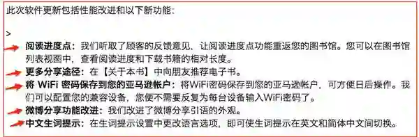 1. 固件升级:亚马逊 Kindle 本月已将固件更新至 5.8.1,而 Kindle Paperwhite 1 及以前的机型已经停更了。建议大家购买新机的时候从第七代(Kindle Paperwhite 3、Kindle Voyage)往上走(第八代 Kindle Oasis、New Kindle),笔者第一时间便对自己的 Kindle 进行了更新。
