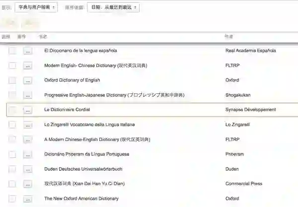 你也可以通过相关途径购买词典然后通过 USB 连接到 PC,然后将词典复制到 Documents 的 Dictionaries 中,接着打开 Kindle,单击右上方的点点点→设备选项→语言和词典→词典→选择自己默认需要的中文和英文的词典。接着,便可开始畅游你的阅读世界了,下图为原生配置的词典☟