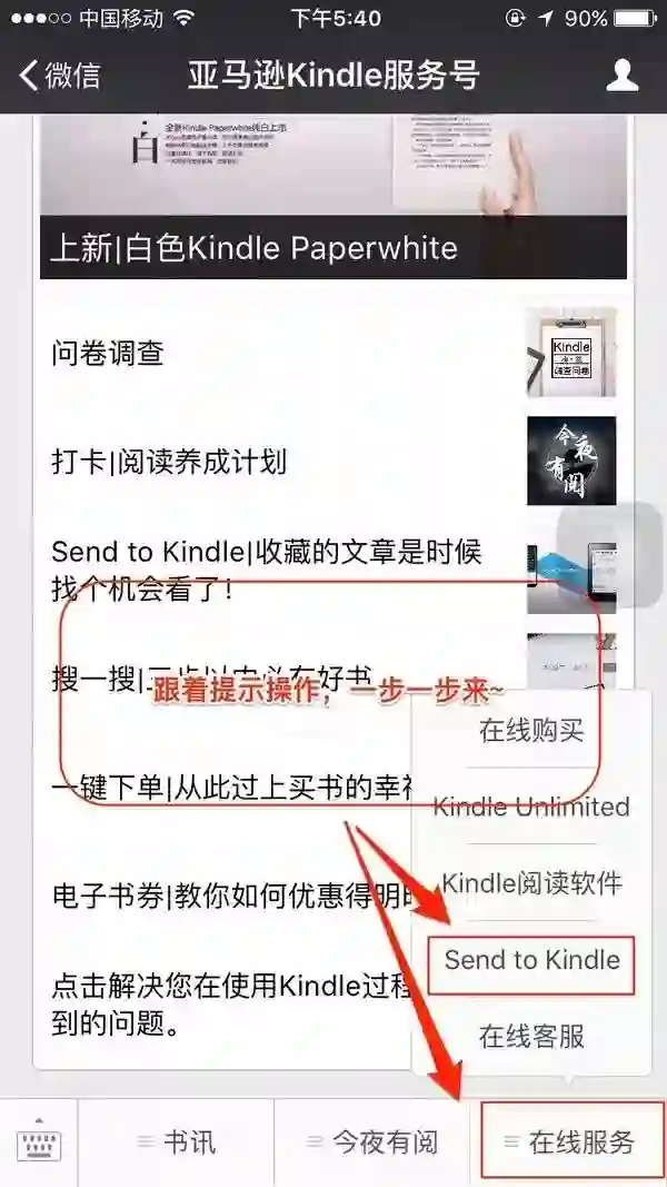 5. Send to Kindle:大家应该都知道可以通过公众号推送内容到 Kindle 吧?没错,在亚马逊的服务号(微信号:cn_kindle)就提供了 Send to Kindle 的功能,只要你看到喜欢的内容,就可以简单操作后进行推送了。