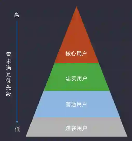 我们先试着抛开滴滴这个问题,而从问题的原点出发考虑一下“当资源有限的时候,应该如何做出产品决策呢?”。在不考虑特殊情况下,一般的决策路径一定是优先满足“核心用户”的需求,然后依次满足“忠实用户”、“普通用户”、“潜在用户”的需求。