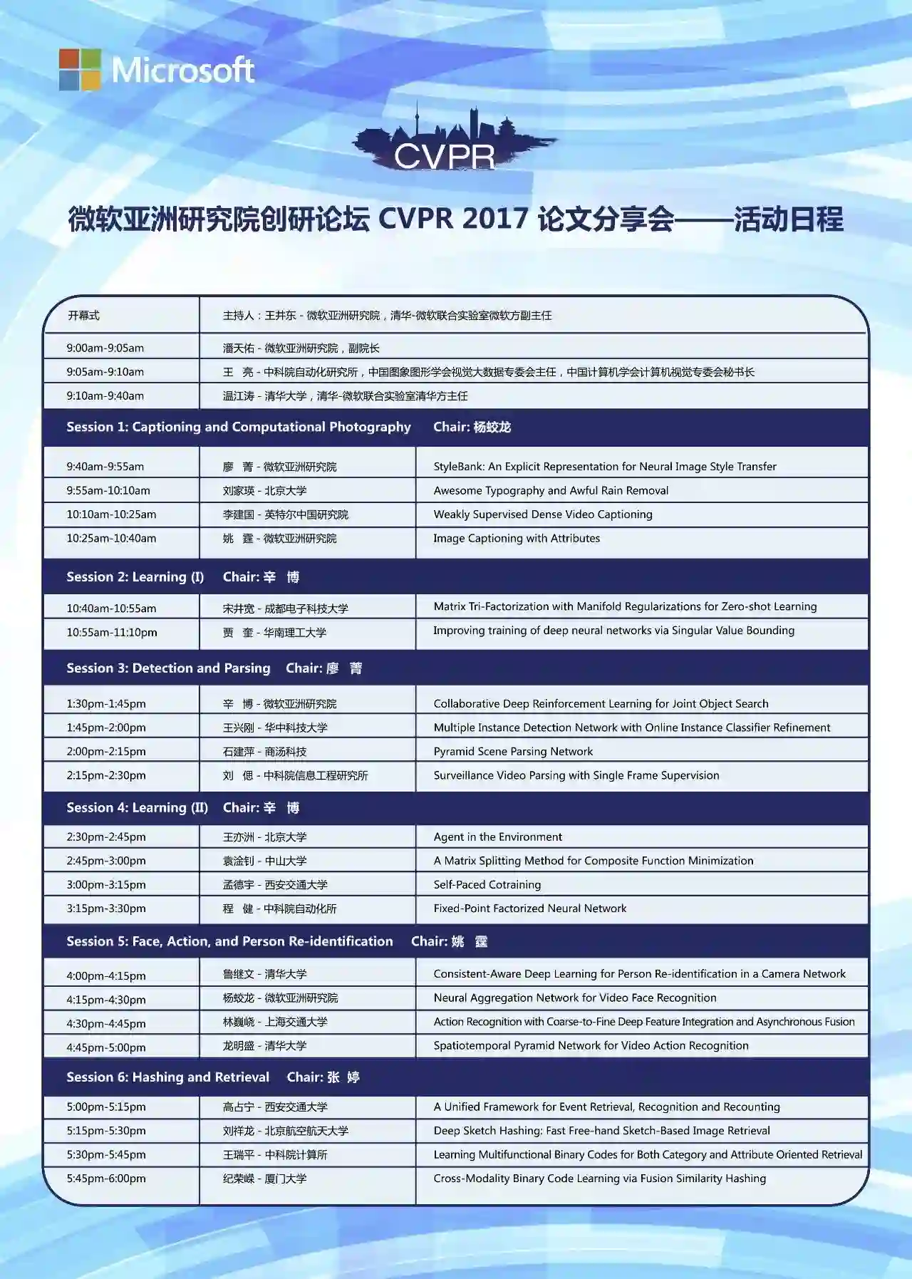 本次“微软亚洲研究院创研论坛——CVPR 2017论文分享会”的直播安排如下: