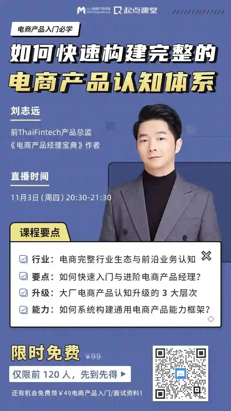 针对这些问题,为了帮助 0-3 岁电商产品新人更快入门与成长,11月3日(周四)晚8点半,人人都是产品经理&起点课堂邀请某独角兽公司产品总监、畅销书《电商产品经理宝典》作者@刘志远,准备了这次直播公开课。