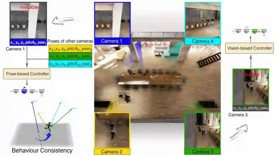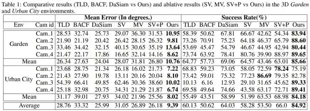 对于监控场景下的多相机主动追踪任务,本文提出的这种多相机协同追踪系统可以在视觉信息不完善的情况下保证追踪性能,得出了优于以往方法的结果。在全新测试环境(Garden/UrbanCity)上的结果展示了