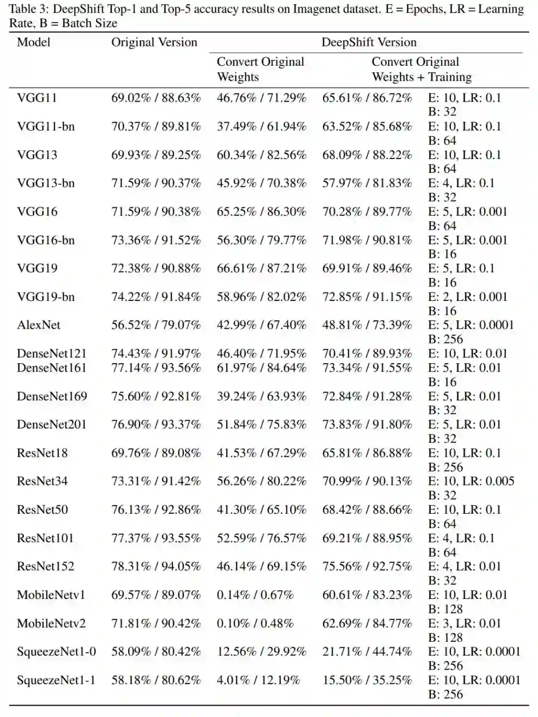 研究者将多种著名 CNN 架构的卷积层和全连接层分别进行卷积移位和全连接移位转换,并进行了大量实验。实验结果表明,有些模型的 Top-1 准确率下降程度低于 4%,Top-5 准确率下降程度低于 1.5%。