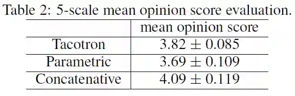 研究人员进行了平均意见得分测试(mean opinion score,MOS)——由测试者对合成语音的自然程度进行 5 分制的李克特量表法(Likert scale score)评分。MOS 的测试者均为母语人群,共使用 100 个事先未展示的短语,每个短语获得 8 次评分。当计算评分时,只有在测试者佩戴耳机时打出的评分被计算在内。作为对比,研究人员将 Tacotron 与参数式(parametric)系统(基于 LSTM(Zen et al., 2016))和拼接式(concatenative)系统(Gonzalvo et al., 2016)做了比较,后两者目前均已投入商业应用。测试结果如下表显示:Tacotron 的 MOS 分数为 3.82,优于参数系统。由于参照基准已经非常强大,以及 Griffin-Lim 合成的引入,这一新方法具有非常好的前景。