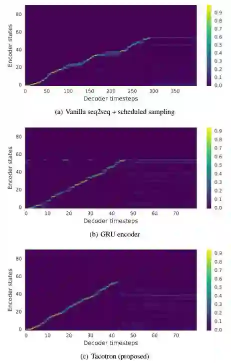 一个文本转语音的合成系统通常需要多个处理阶段,例如文本分析前端、声学模型和音频合成模块。构建这些组件经常需要多种领域的专业知识,而且设计选择也可能很脆弱。在本论文里,我们提出了 Tacotron——一种端到端的生成式文本转语音模型,可以直接从字符合成语音。通过<text, audio>配对数据集的训练,该模型可以完全从随机初始化从头开始训练。我们提出了几个可以使该序列到序列框架在这个高难度任务上表现良好的关键技术。Tacotron 在美式英语测试里的平均主观意见评分达到了 3.82 分(总分是 5 分),在自然感(naturalness)方面优于已在生产中应用的参数系统(parametric system)。此外,由于 Tacotron 是在帧(frame)层面上生成语音,所以它比样本级自回归(sample-level autoregressive)方式快得多。