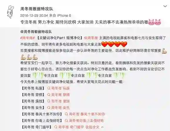 比如周冬雨的数据特攻队,会强调「看到负面不要出于好奇心去点击」、「要点击净化过的搜索关联词」。宋茜的后援团相互提醒:签到需要重视起来,豆瓣评分是重中之重,「要多给其他的电影打分,账号和昵称可以隐晦一点,还没播的电视剧不要打分」。景甜特攻组则会「日常播报扎心数据」,自发统计各平台热度和战果。