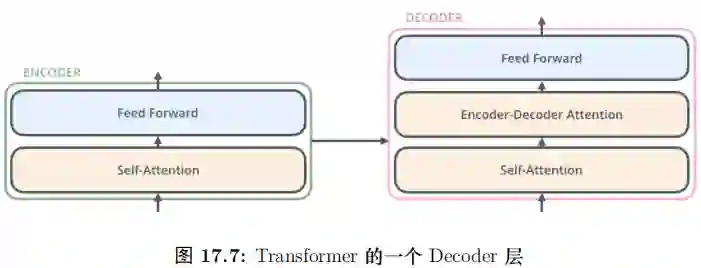 每一层的 Encoder 都是相同的结构,它有一个 Self-Attention 层和一个前馈网络(全连接网络) 组成,15.54如图所示。每一层的 Decoder 也是相同的结果,它除了 Self-Attention 层和全连接层之外还多了一个普通的 Attention 层,这个 Attention 层使得 Decoder 在解码时会考虑最后一层 Encoder 所有时刻的输出。它的结构如图17.3所示。