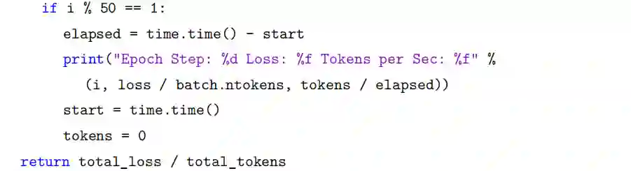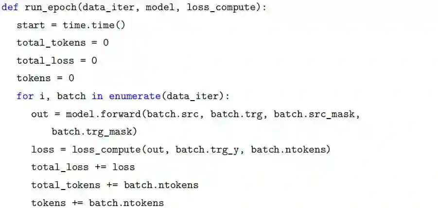 它遍历一个 epoch 的数据,然后调用 forward,接着用 loss_compute 函数计算梯度,更新参数并且返回 loss。这里的 loss_compute 是一个函数,它的输入是模型的预测 out,真实的标签序列 batch.trg_y 和 batch 的词个数。实际的实现是MultiGPULossCompute 类,这是一个 callable。本来计算损失和更新参数比较简单,但是这里为了实现多 GPU 的训练,这个类就比较复杂了。