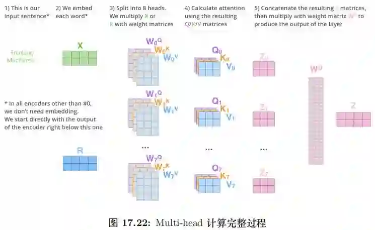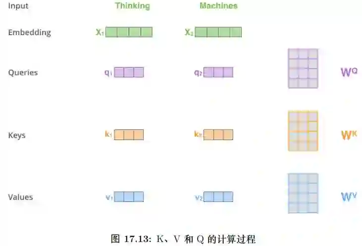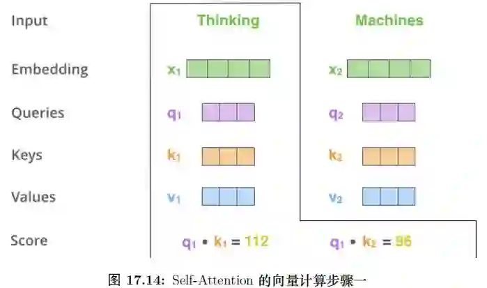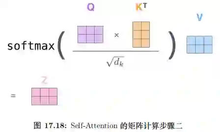 接下来就是计算 Q 和 K 得到 score,然后除以,然后再 softmax,最后加权平均得到输出。全过程如图17.14所示。