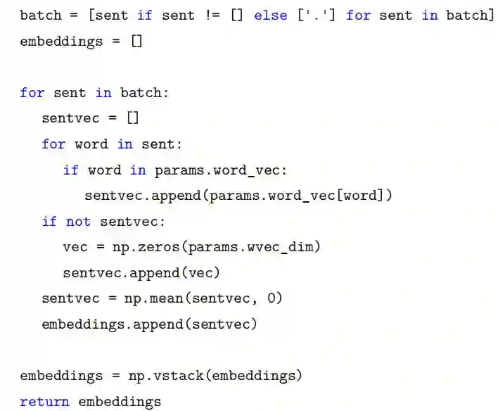 batcher 函数的输入参数是前面的 params 和 batch,batch 就是句子列表,我们需要对它做 Sentence Embedding,这里的实现很简单,就是把词向量加起来求平均值得到句子向量。