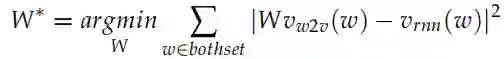。那怎么求这个变换矩阵 W 呢?因为两个训练语料会有公共的词 (通常训练 word2vec 的语料比 skip vector 大得多,从而词也多得多)。因此我们可以用这些公共的词来寻找 W。寻找的依据是:遍历所有可能的 W,使得Wvw2v 和 vrnn 尽量接近。用数学语言描述就是: