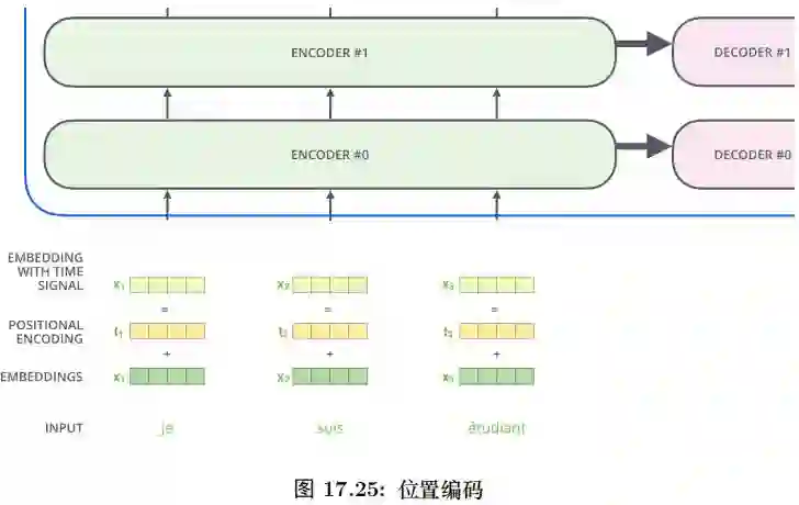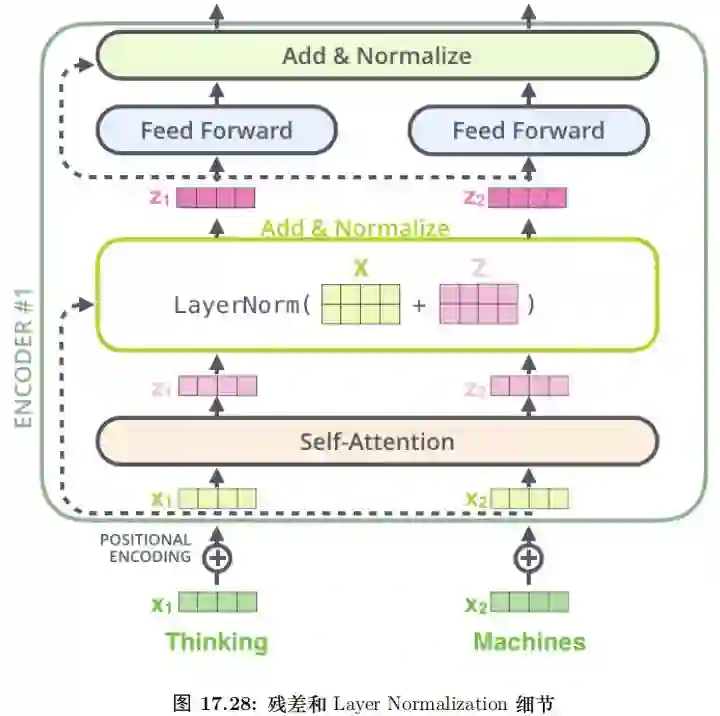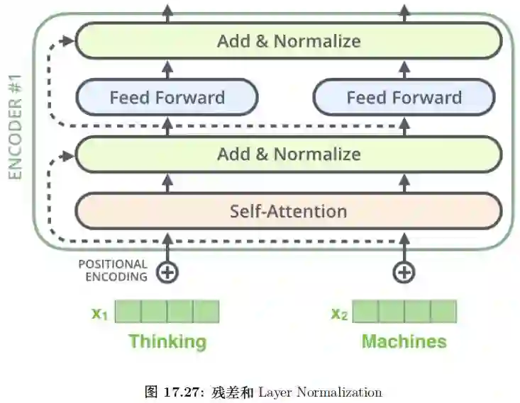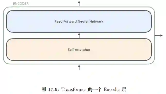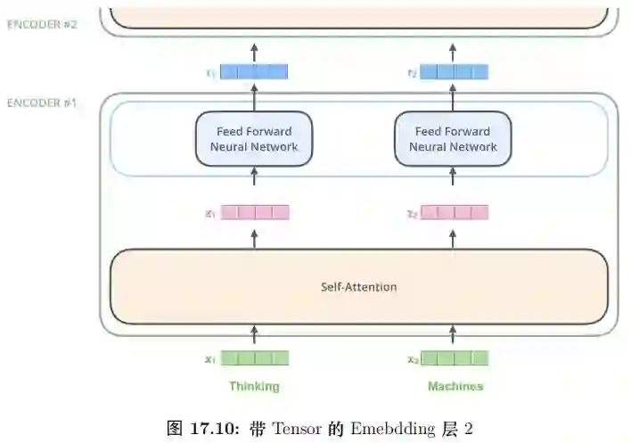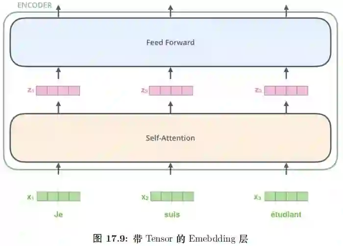 Embedding 之后的序列会输入 Encoder,首先经过 Self-Attention 层然后再经过全连接层,如图17.5所示。