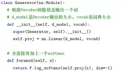 我们首先后面三个简单的参数,Generator 直接构造就行了,它的作用是把模型的隐单元变成输出词的概率。而 src-embed 是一个 Embeddings 层和一个位置编码层c(position),tgt-embed 也是类似的。