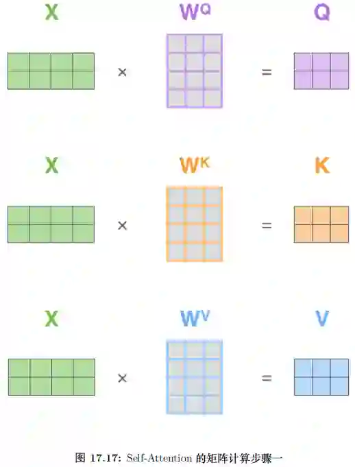 第一步还是计算 Q、K 和 V,不过不是计算某个时刻的 qt, kt, vt 了,而是一次计算所有时刻的 Q、K 和 V。