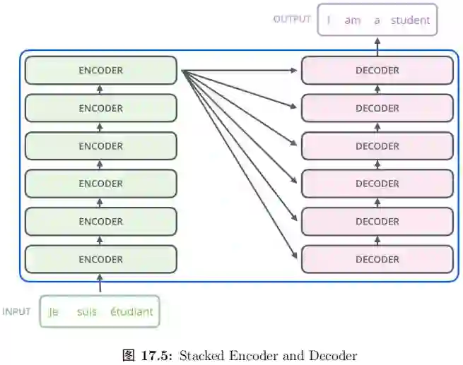 再展开一点,Encoder 由很多 (6 个) 结构一样的 Encoder 堆叠 (stack) 而成,Decoder 也是一样。如图15.53所示。注意:每一个 Encoder 的输入是下一层 Encoder输出,最底层 Encoder 的输入是原始的输入 (法语句子);Decoder 也是类似,但是最后一层 Encoder 的输出会输入给每一个 Decoder 层,这是 Attention 机制的要求。