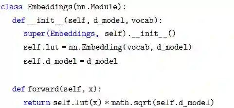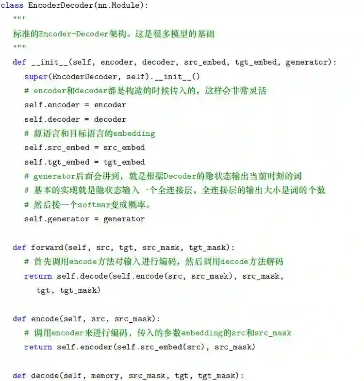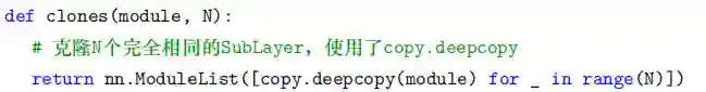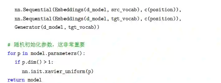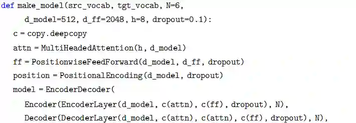 首先把 copy.deepcopy 命名为 c,这样使下面的代码简洁一点。然后构造 MultiHeadedAttention,PositionwiseFeedForward 和 PositionalEncoding 对象。接着就是构造 EncoderDecoder 对象。它需要 5 个参数:Encoder、Decoder、src-embed、tgt-embed和 Generator。