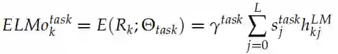 ELMo 会根据不同的任务,把上面得到的双向的 LSTM 的不同层的隐状态组合起来。对于输入的词 tk,我们可以得到 2L+1 个向量,分别是=1, 2, ..., L},我们把它记作