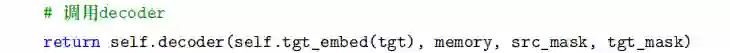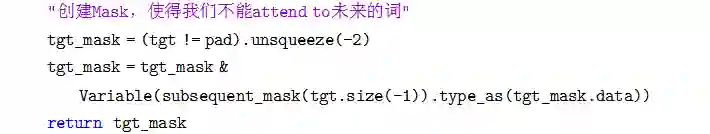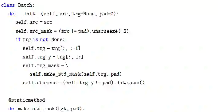 对于训练来说 (TeachingForcing模式),Decoder 有一个输入和一个输出。比如句子”<sos> it is a good day <eos>”,输入会变成”<sos> it is a good day”,而输出为”it is a good day <eos>”。对应到代码里,self.trg 就是输入,而 self.trg_y 就是输出。接着对输入 self.trg 进行 mask,使得 Self-Attention 不能访问未来的输入。这是通过 make_std_mask 函数实现的,这个函数会调用我们之前详细介绍过的subsequent_mask函数。