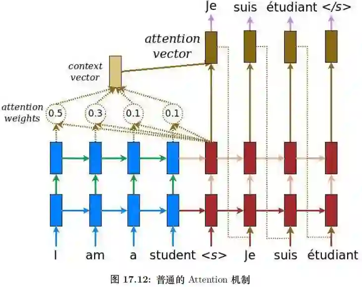 我们对比一些普通的 Attention(Luong 2015),使用内积计算 energy 的情况。如图17.8所示,在这里,每个向量的 Key 和 Value 向量都是它本身,而 Q 是当前隐状态 ht,计算 energy etj 的时候我们计算 Q(ht) 和Key(barhj)。然后用 softmax 变成概率,最后把所有的 barhj 加权平均得到 context 向量。
