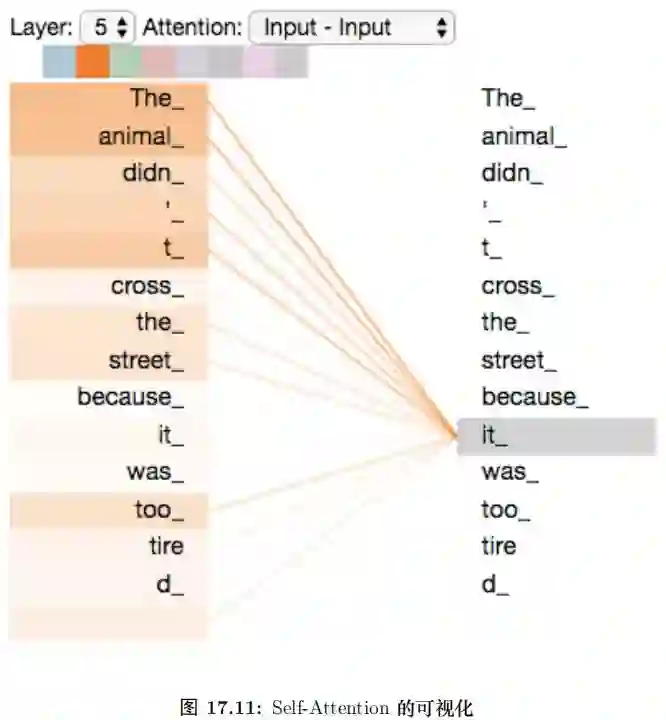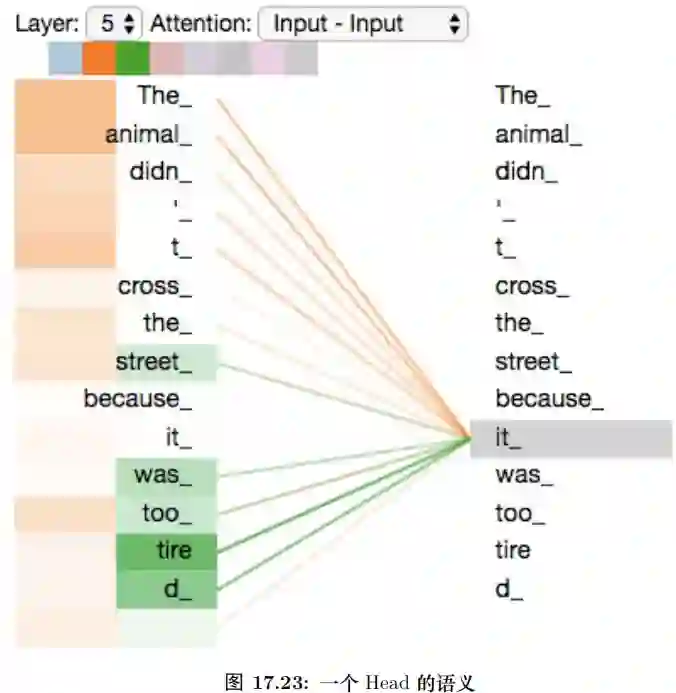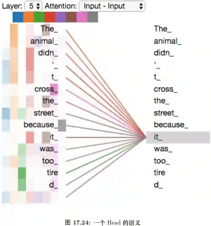 下图17.7是模型的最上一层 (下标 0 是第一层,5 是第六层)Encoder 的Attention可视化图。这是 tensor2tensor 这个工具输出的内容。我们可以看到,在编码 it 的时候有一个 Attention Head(后面会讲到) 注意到了Animal,因此编码后的 it 有 Animal的语义。