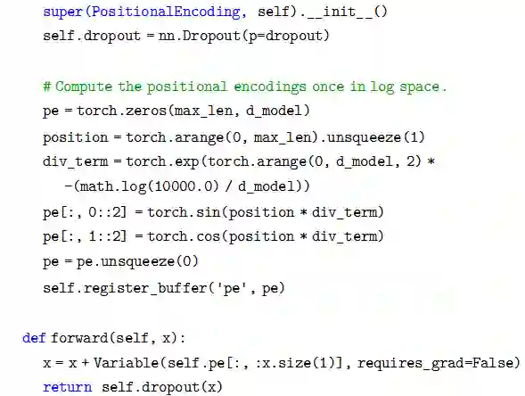 假设输入是 ID 序列长度为 10,如果输入 Embedding 之后是 (10, 512),那么位置编码的输出也是 (10, 512)。上式中 pos 就是位置 (0-9),512 维的偶数维使用 sin 函数,而奇数维使用 cos 函数。这种位置编码的好处是:可以表示成 PEpos 的线性函数,这样网络就能容易的学到相对位置的关系。代码为: