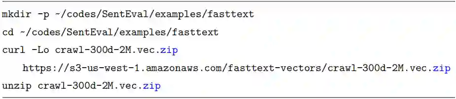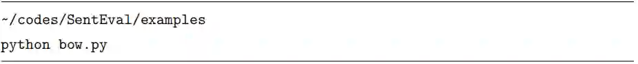然后从https://github.com/facebookresearch/SentEval.git clone 代码。SentEval 提供了一些baseline 系统,包括 bow、infersent 和 skipthought 等等。读者如果实现了一种新的Sentence Embedding 算法,那么可以参考 baseline 的代码用 SentEval 来评价算法的好坏。
