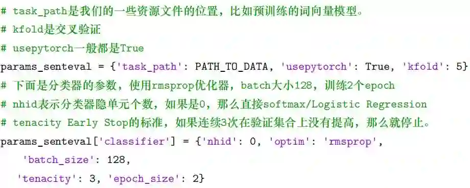 构造 senteval.engine.SE 需要传入 3 个参数,params_senteval, batcher 和 prepare。params_senteval 是控制 SentEval 模型训练的一些超参数。比如 bow.py 里的: