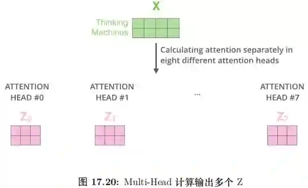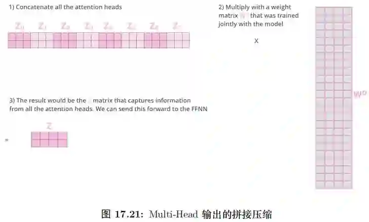 把多个 head 输出的 Z 按照第二个维度拼接起来,但是这样的特征有一些多,因此Transformer 又用了一个线性变换 (矩阵 WO) 对它进行了压缩。这个过程如图17.17所示。