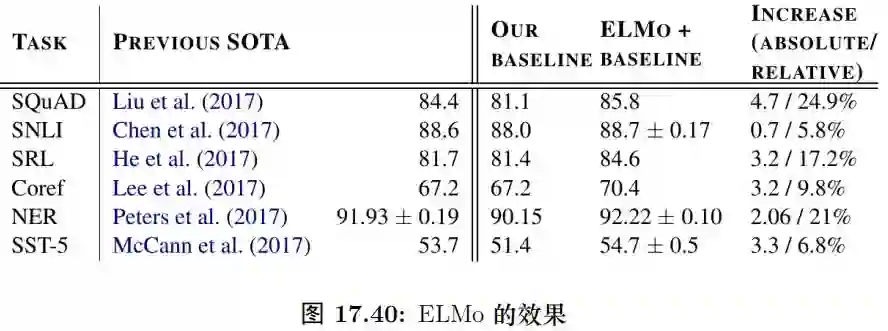 图15.90是 ELMo 在 SQuAD、SNLI 等常见任务上的效果,相对于 Baseline 系统都有不小的提高。