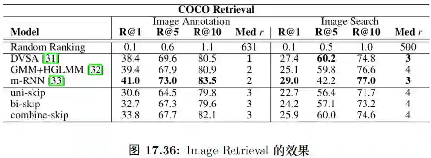 这个任务的输入是一幅图片和一个句子,模型输出的是它们的相关性 (句子是否描述了图片的内容)。句子我们可以用 Skip Thought Vector 编码成一个向量;而图片也可以用预训练的 CNN 编码成一个向量。模型细节这里不再赘述了,最终的结果如图15.86所示。