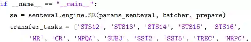 首先构造 senteval.engine.SE,然后列举需要跑的 task,最后调用 se.eval 得到结果。