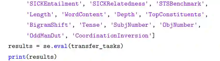 为了解决这些问题,Facebook 做了 SentEval 这个工具。这是一个用于评估Universal Sentence Representation 的工具,所谓的 Universal Sentence Representation是指与特定任务无关的通用的句子表示 (Embedding) 方法。为了保证公平公正,这个工具只评价句子的 Embedding,对于具体的任务,大家都使用相同的预处理,网络结构和后处理,从而能够保证比较公平的评测。