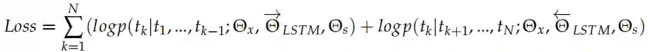 通过这个 RNN,我们可以得到。我们把这两个方向的 RNN 合并起来就得到 Bi-LSTM。我们优化的损失函数是两个 LSTM 的交叉熵加起来是最小的: