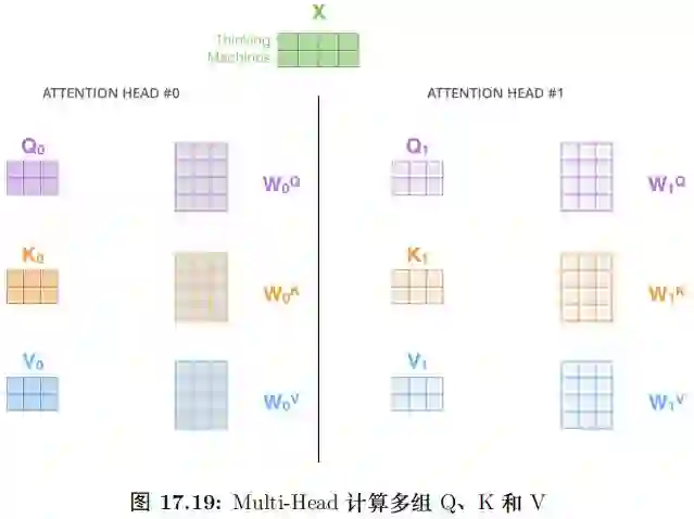 计算 Q、K 和 V 的过程还是一样,这不过现在变换矩阵从一组