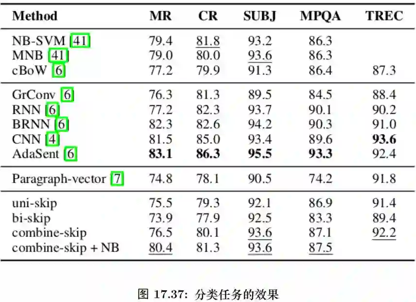 这里比较了 5 个分类任务:电影评论情感分类 (MR), 商品评论情感分类 (CR) [37],主观/客观分类 (SUBJ) [38], 意见分类 (MPQA) 和 TREC 问题类型分类。结果如图15.87所示。
