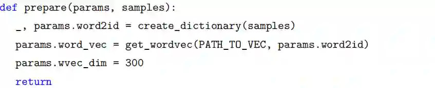 这个函数相当于初始化的回调函数,参数会传入 params 和 samples,samples 就是所有的句子,我们需要根据这些句子来做一些初始化的工作,结果存在 params 里,后面会用到。这里我们用 samples 构造 word2id——word 到 id 的映射,另外根据word2id,从预训练的词向量里提取需要的词向量 (因为预训练的词向量有很多词,但是在某个具体任务中用到的词是有限的,我们只需要提取需要的部分),另外把词向量的维度保持到 params 里。