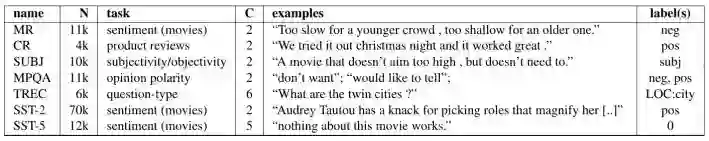 为了验证效果,本文把 Sentence Embedding 作为下游任务的输入特征,任务包括分类 (情感分类),SNI(RTE) 等。前者的输入是一个句子,而后者的输入是两个句子。