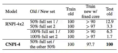 表 3:单个固定核学习新程序/组合子并记忆旧程序/组合子的准确率。用新程序/组合子训练,RNPI 和 CNPI 取得的最高准确率分别为 100% 和 97.7%。