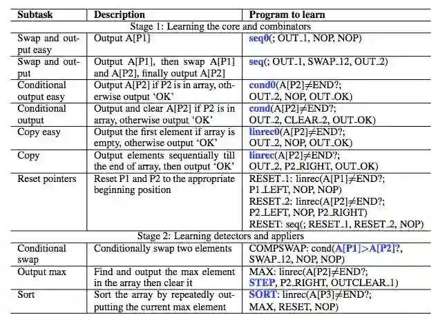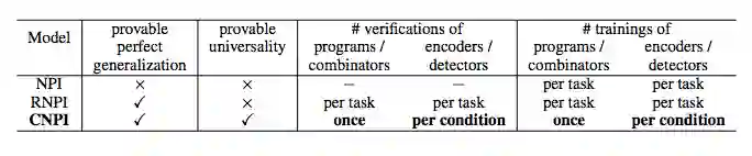 这些模型中的一个特例是神经编程器-解释器(NPI)(Reed & de Freitas, 2016)及其支持递归的扩展形式(Cai et al., 2017,在该论文中被称为 RNPI)。NPI 包含三个组件:一个核心控制器,通常由递归神经网络(RNN)实现;一个程序存储器,用于存储已学得程序的嵌入向量;还有多个特定域编码器,让单个 NPI 在多种环境中均可运行。核心控制器不学习任何特定的程序,而是学习解释任何一个用向量表示的程序,即模仿一个通用图灵机。核心控制器(即解释器)与已学得程序的存储器(即编程器)相结合,使 NPI 能够通过合子程序来学习新的程序,其架构更灵活也更具可组合性。然而,NPI 在理论和实际应用方面依然存在一些局限。